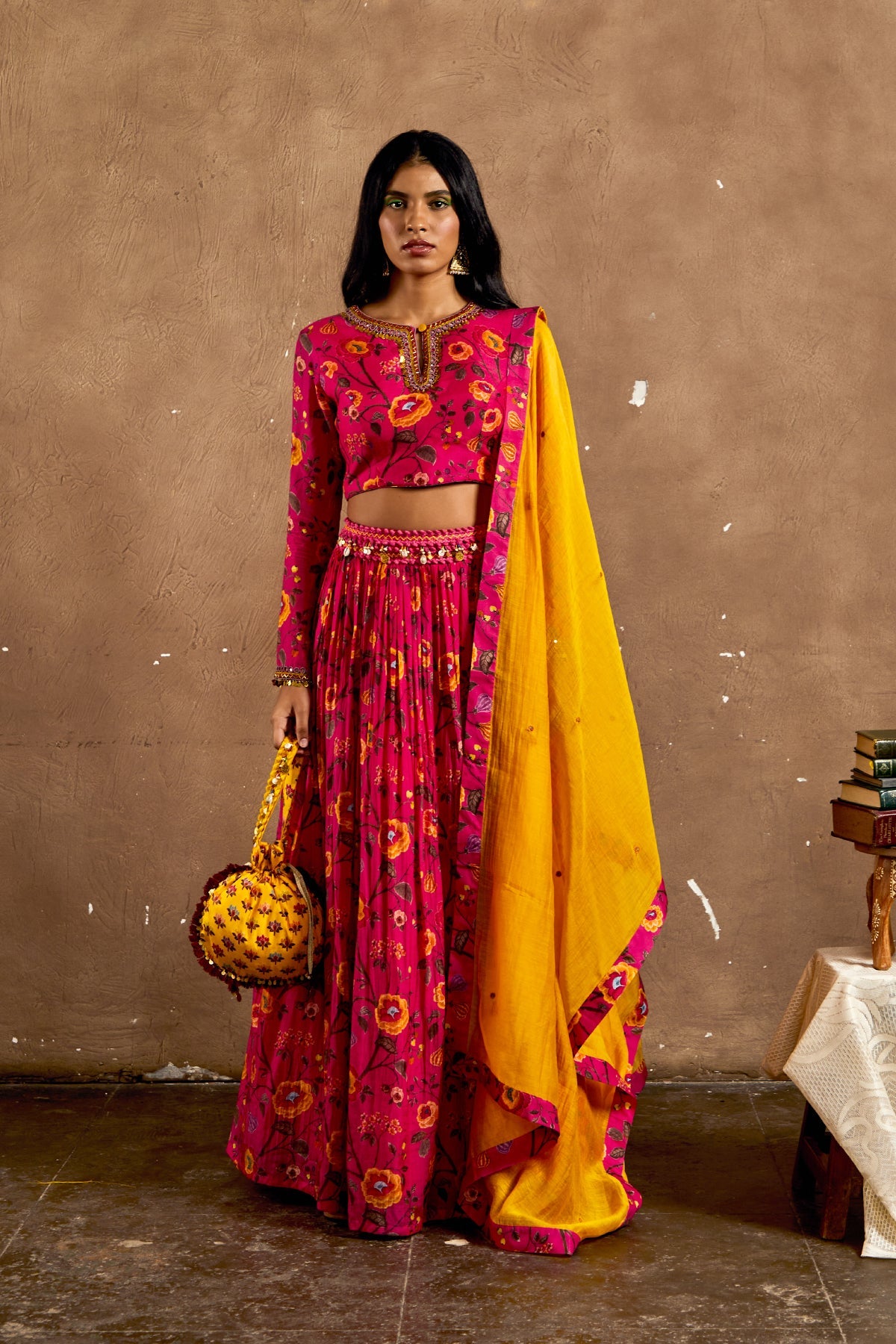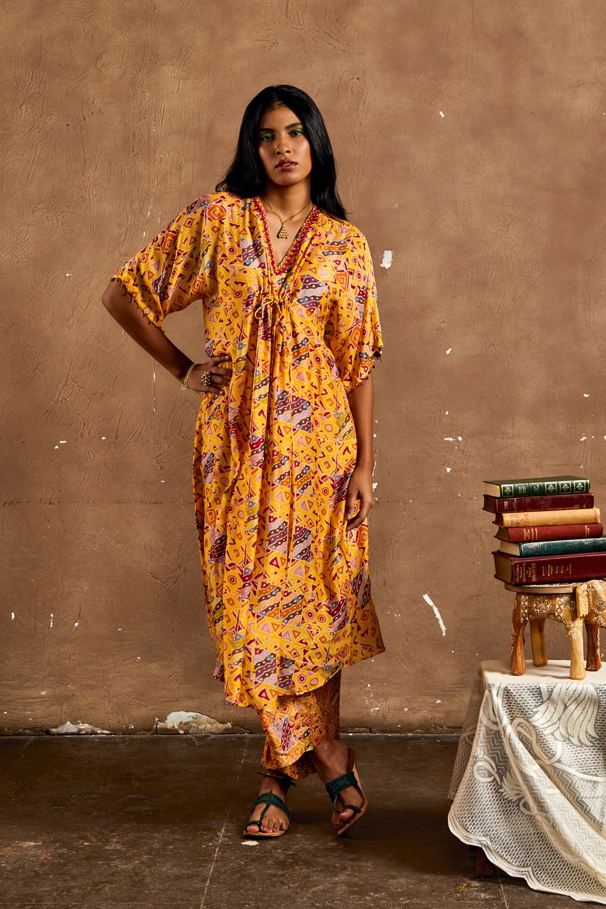 YELLOW CHANDERI EMBROIDERED RAAS KURTA SET