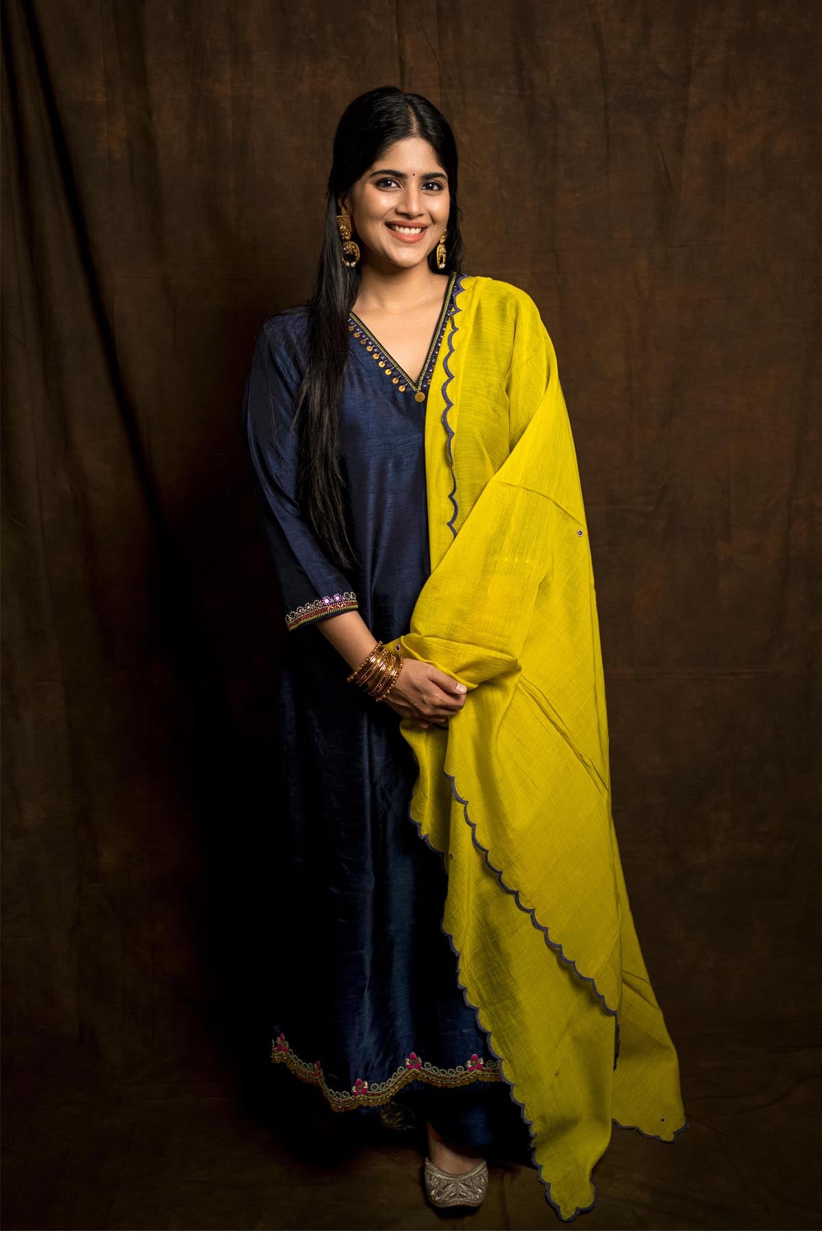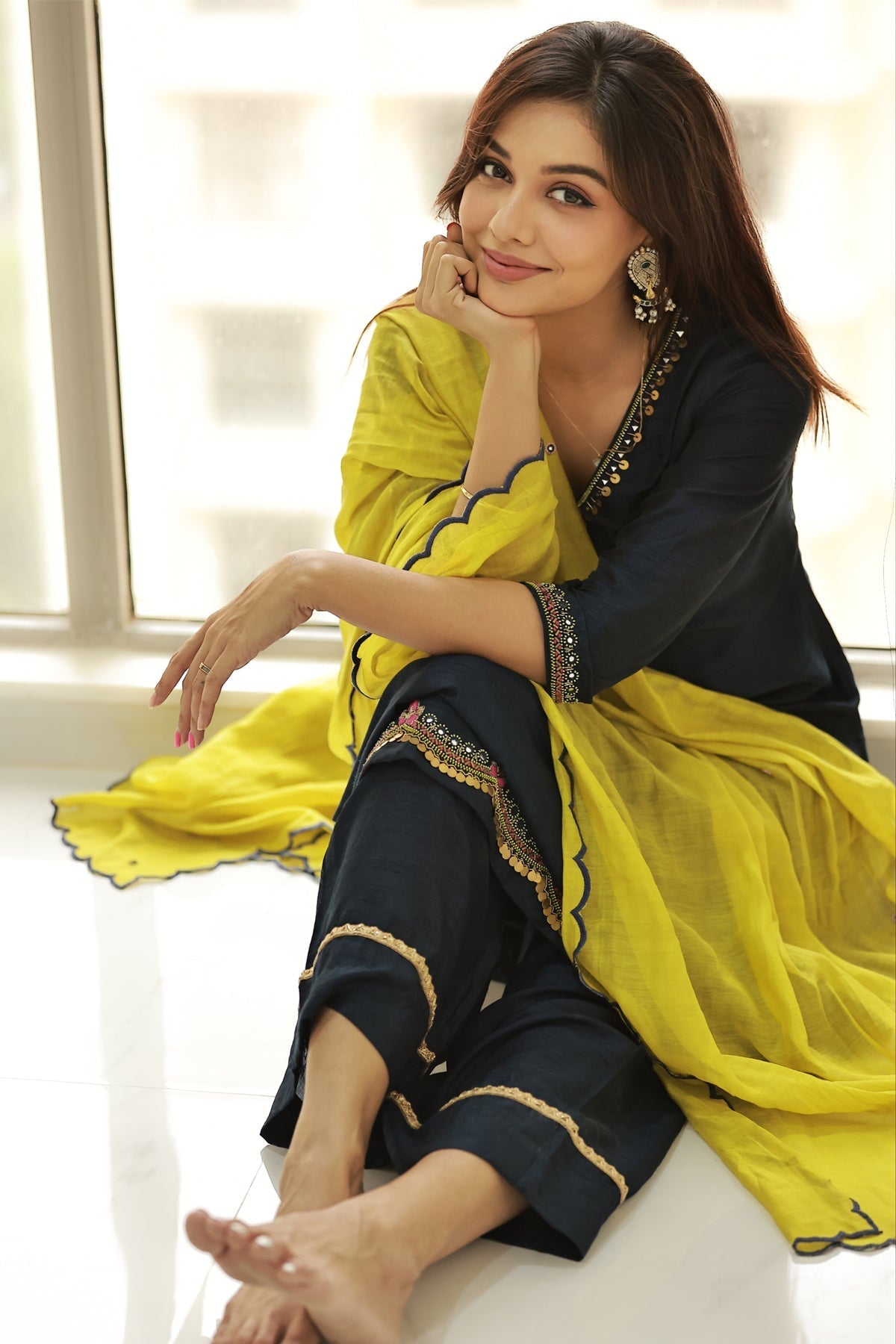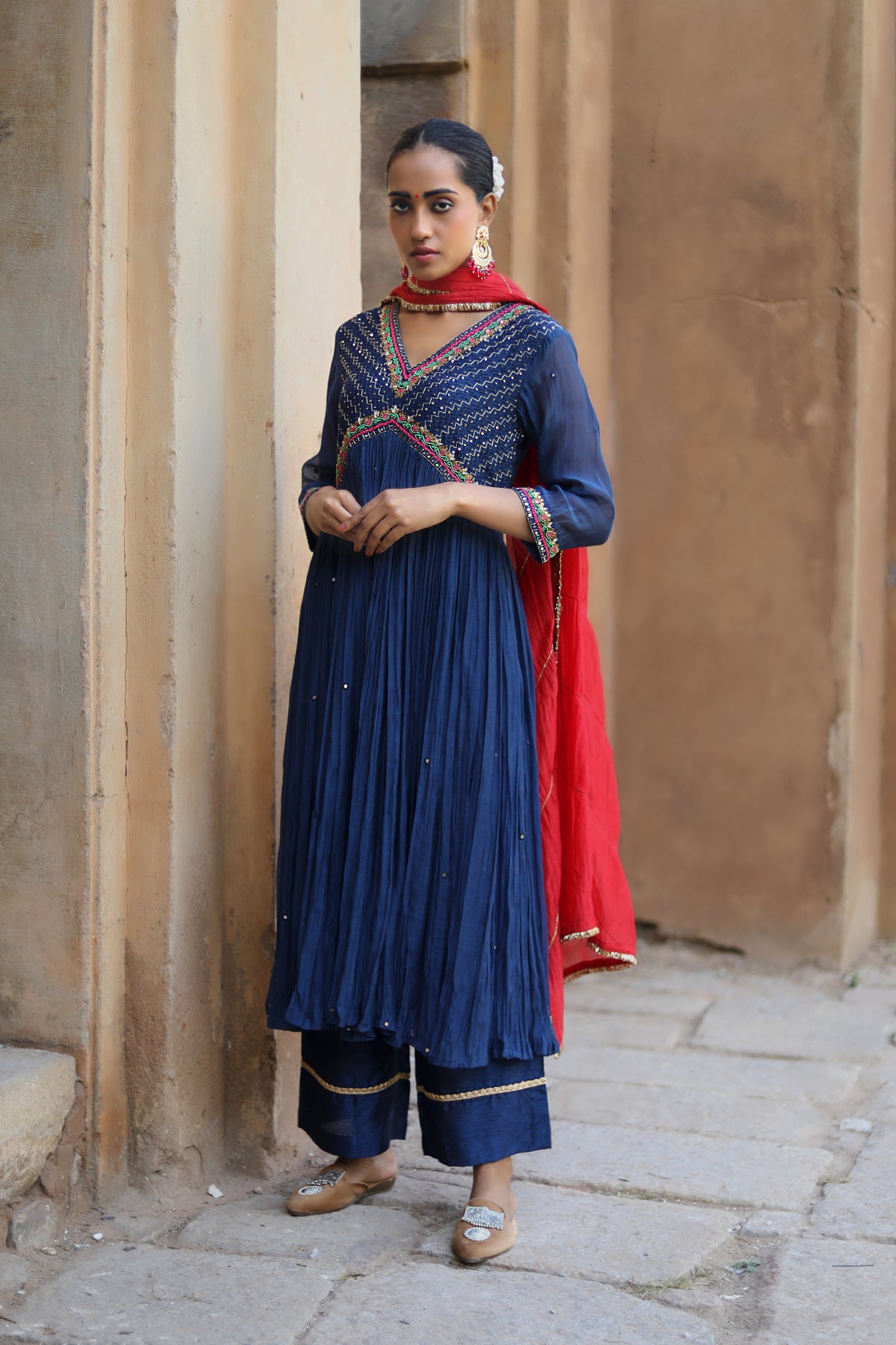 NAVY BLUE CHANDERI EMBROIDERED RAAS KURTA SET