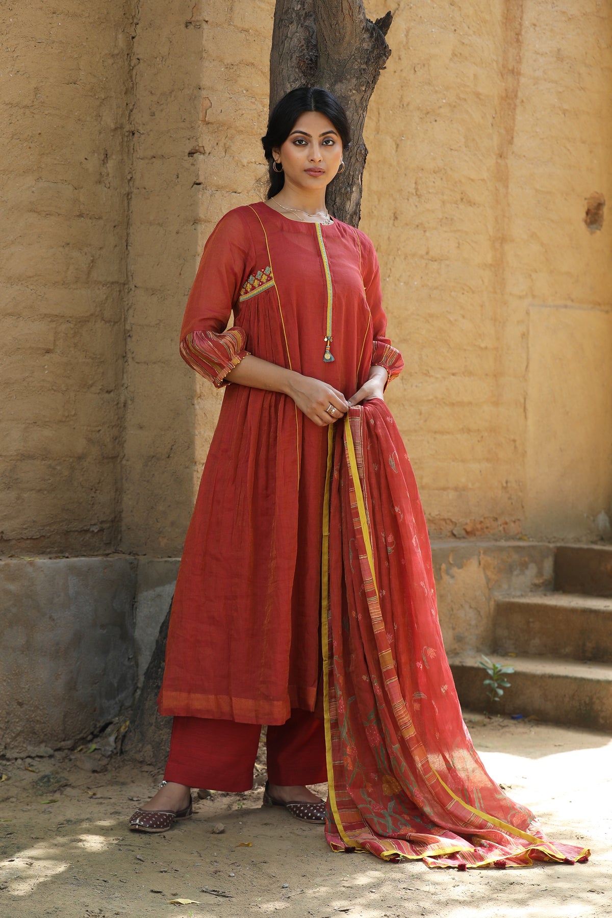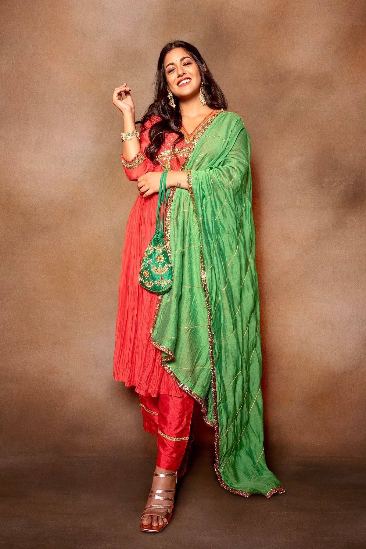 PEACH CHANDERI RAAS KALIDAR SUIT